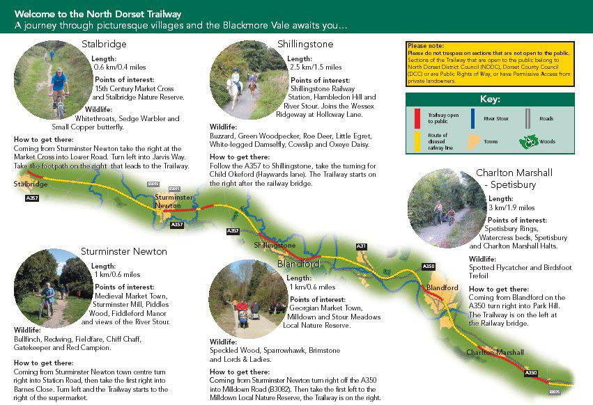 The North Dorset Trailway is a walking, cycling and horse riding route from Sturminster Newton to Spetisbury. The trailway is part of a larger scheme to provide an off-road sustainable route through Somerset and Dorset following the disused Somerset and Dorset railway line. For walkers, there are links to the Stour Valley Way, The Wessex Ridgeway, The Jubilee Trail, and Hod and Hambledon Hills. Open Access land and nature reserves and woods such as Piddles Wood and Blandford Forest are within easy walking distance of the Trailway.